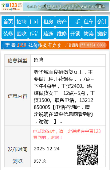 老华城面食招做货女工,主要做几种开花馒头,早7点~下午4点半,工资2400。烘焙做货女工一12点~5点,工资1500。联系电话。13212850005 【电话咨询时,请一定说明在望奎信息网看到的,谢谢!】 |