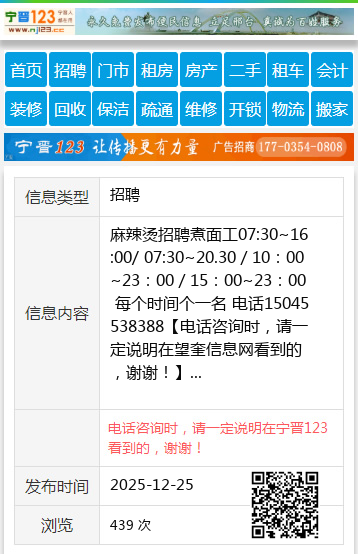 麻辣烫招聘煮面工07:30~16:00/ 07:30~20.30/10:00~23:00/15:00~23:00 每个时间个一名 电话15045538388 【电话咨询时,请一定说明在望奎信息网看到的,谢谢!】 |