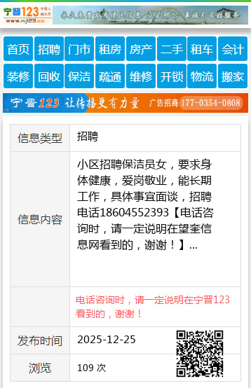 小区招聘保洁员女,要求身体健康,爱岗敬业,能长期工作,具体事宜面谈,招聘电话18604552393