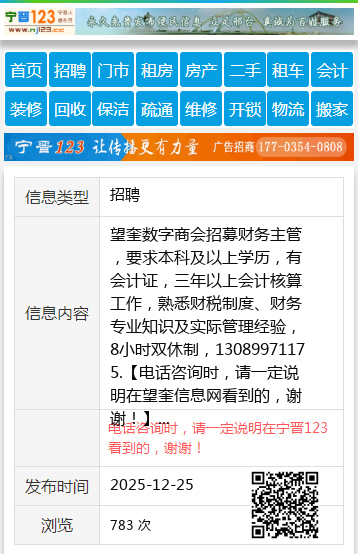 望奎数字商会招募财务主管,要求本科及以上学历,有会计证,三年以上会计核算工作,熟悉财税制度、财务专业知识及实际管理经验,8小时双休制,13089971175. 【电话咨询时,请一定说明在望奎信息网看到的,谢谢!】 |