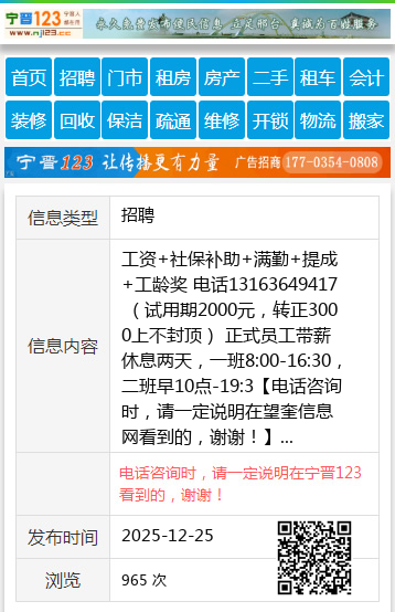 工资+社保补助+满勤+提成+工龄奖 电话13163649417 (试用期2000元,转正3000上不封顶) 正式员工带薪休息两天,一班8:00-16:30,二班早10点-19:3 【电话咨询时,请一定说明在望奎信息网看到的,谢谢!】 |