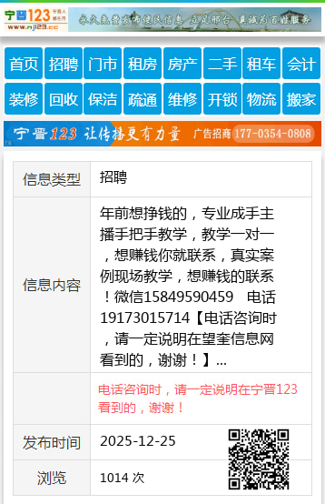 年前想挣钱的,专业成手主播手把手教学,教学一对一,想赚钱你就联系,真实案例现场教学,想赚钱的联系!微信15849590459 电话19173015714 【电话咨询时,请一定说明在望奎信息网看到的,谢谢!】 |