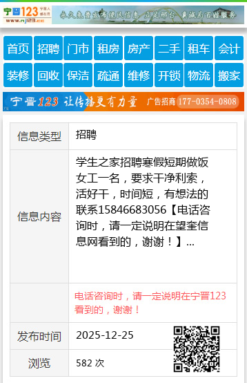 学生之家招聘寒假短期做饭女工一名,要求干净利索,活好干,时间短,有想法的联系15846683056