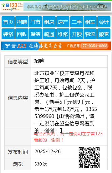 北方职业学校开高级月嫂和护工班,月嫂每期12天,护工每期7天,包教包会,联系办证书,护工包送公司上岗。(新手5千元到9千元,老手1万元到1.2万元, 13555399960 【电话咨询时,请一定说明在望奎信息网看到的,谢谢!】 |
