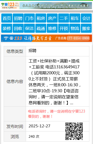 工资+社保补助+满勤+提成+工龄奖 电话13163649417 (试用期2000元,转正3000上不封顶) 正式员工带薪休息两天,一班8:00-16:30,二班早10点-19:30 【电话咨询时,请一定说明在望奎信息网看到的,谢谢!】 |