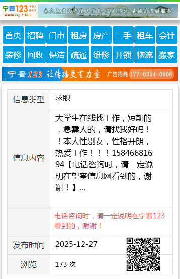 大学生在线找工作,短期的,急需人的,请找我好吗!!本人性别女,性格开朗,热爱工作!!!15846681694