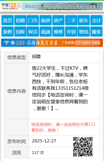 男22大学生,干过KTV,脾气好活好,擅长沟通,学东西快,干到年前,各位老板有活联系我13351151214微信同步