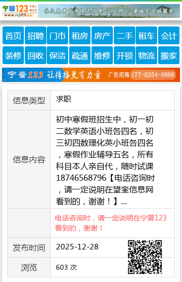 初中寒假班招生中,初一初二数学英语小班各四名,初三初四数理化英小班各四名,寒假作业辅导五名,所有科目本人亲自代,随时试课18746568796 【电话咨询时,请一定说明在望奎信息网看到的,谢谢!】 |