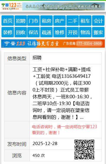工资+社保补助+满勤+提成+工龄奖 电话13163649417 (试用期2000元,转正3000上不封顶) 正式员工带薪休息两天,一班8:00-16:30,二班早10点-19:30 【电话咨询时,请一定说明在望奎信息网看到的,谢谢!】 |