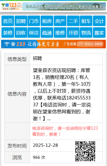 望奎县农资店现招聘:库管1名,销售经理20名(有人教有人带),第一年5-10万,以后上不封顶,薪资待遇优厚,联系电话18245553337 【电话咨询时,请一定说明在望奎信息网看到的,谢谢!】 |