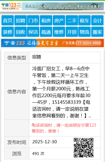 冷面厂招女工,早8—6点中午管饭,第二天一上午卫生,下午放假这样循环工作,第一个月薪2000元,熟练工作后2200元每月要求年龄30—45岁,15145583339 【电话咨询时,请一定说明在望奎信息网看到的,谢谢!】 |