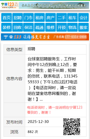 台球室招聘服务生,工作时间中午12点到晚上12点,要求:男生,能干长期,短期的勿扰,联系电话,13134559333(下午1点以后打电话) 【电话咨询时,请一定说明在望奎信息网看到的,谢谢!】 |