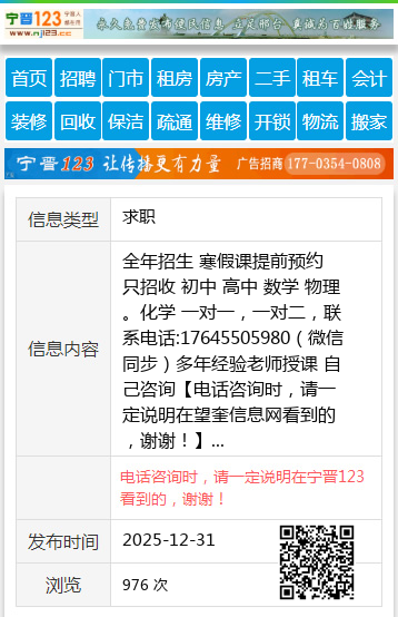 全年招生 寒假课提前预约 只招收 初中 高中 数学 物理。化学 一对一,一对二,联系电话:17645505980(微信同步)多年经验老师授课 自己咨询 【电话咨询时,请一定说明在望奎信息网看到的,谢谢!】 |