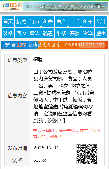 由于公司发展需要,现招聘县内送货司机(食品)人员一名。男,30岁-48岁之间,工资+提成+满勤,每月带薪假两天,中午供一顿饭,有经验者优先!15804558077