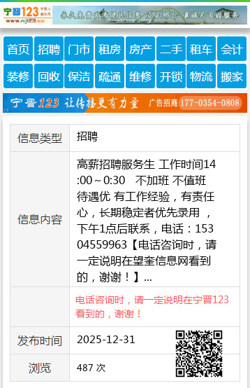 高薪招聘服务生 工作时间14:00~0:30 不加班 不值班 待遇优 有工作经验,有责任心,长期稳定者优先录用 ,下午1点后联系,电话:15304559963 【电话咨询时,请一定说明在望奎信息网看到的,谢谢!】 |