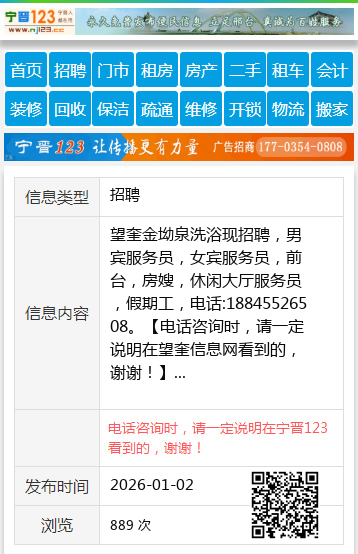 望奎金坳泉洗浴现招聘,男宾服务员,女宾服务员,前台,房嫂,休闲大厅服务员,假期工,电话:18845526508。