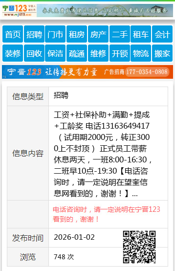 工资+社保补助+满勤+提成+工龄奖 电话13163649417 (试用期2000元,转正3000上不封顶) 正式员工带薪休息两天,一班8:00-16:30,二班早10点-19:30 【电话咨询时,请一定说明在望奎信息网看到的,谢谢!】 |