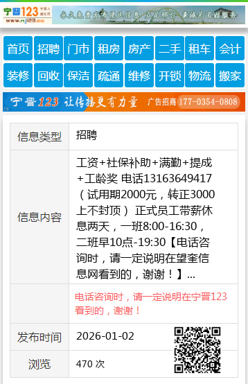工资+社保补助+满勤+提成+工龄奖 电话13163649417 (试用期2000元,转正3000上不封顶) 正式员工带薪休息两天,一班8:00-16:30,二班早10点-19:30 【电话咨询时,请一定说明在望奎信息网看到的,谢谢!】 |