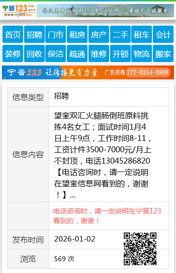 望奎双汇火腿肠倒班原料挑拣4名女工;面试时间1月4日上午9点,工作时间8-11,工资计件3500-7000元/月上不封顶,电话13045286820 【电话咨询时,请一定说明在望奎信息网看到的,谢谢!】 |