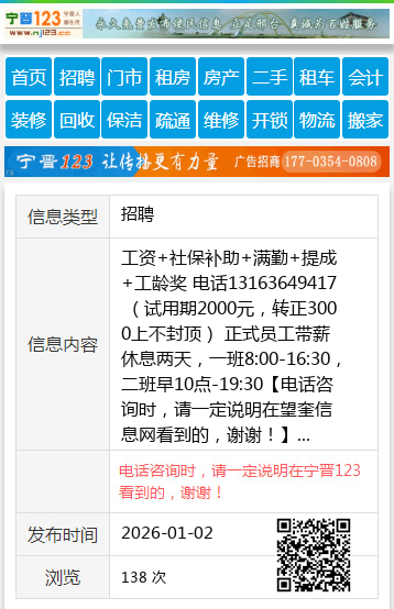 工资+社保补助+满勤+提成+工龄奖 电话13163649417 (试用期2000元,转正3000上不封顶) 正式员工带薪休息两天,一班8:00-16:30,二班早10点-19:30 【电话咨询时,请一定说明在望奎信息网看到的,谢谢!】 |