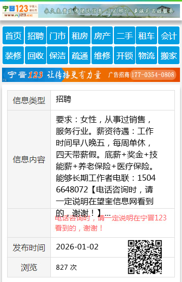 要求:女性,从事过销售,服务行业。薪资待遇:工作时间早八晚五,每周单休,四天带薪假。底薪+奖金+技能薪+养老保险+医疗保险。能够长期工作者电联:15046648072 【电话咨询时,请一定说明在望奎信息网看到的,谢谢!】 |