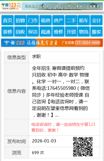 全年招生 寒假课提前预约 只招收 初中 高中 数学 物理。化学 一对一,一对二,联系电话:17645505980(微信同步)多年经验老师授课 自己咨询 【电话咨询时,请一定说明在望奎信息网看到的,谢谢!】 |
