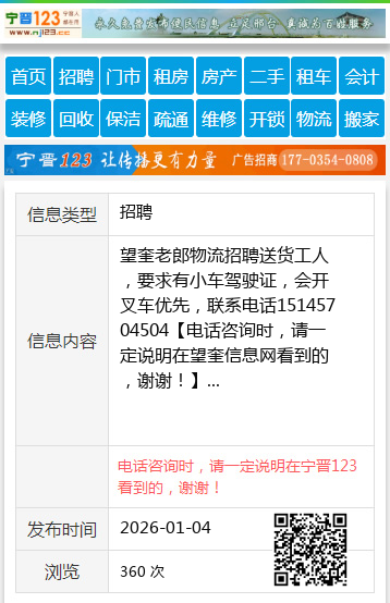望奎老郎物流招聘送货工人,要求有小车驾驶证,会开叉车优先,联系电话15145704504