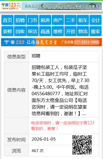 招聘包装工人,包装瓜子坚果长工临时工均可,临时工70/天,女工优先,早上7.30-晚上5.00。中午供饭。电话04556480777,地址双汇对面东方太格食品公司 【电话咨询时,请一定说明在望奎信息网看到的,谢谢!】 |