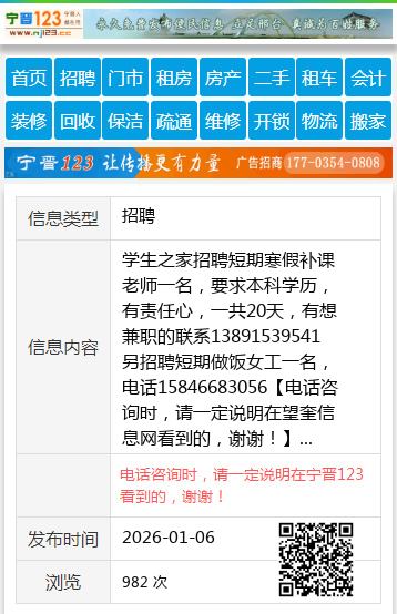 学生之家招聘短期寒假补课老师一名,要求本科学历,有责任心,一共20天,有想兼职的联系13891539541 另招聘短期做饭女工一名,电话15846683056 【电话咨询时,请一定说明在望奎信息网看到的,谢谢!】 |