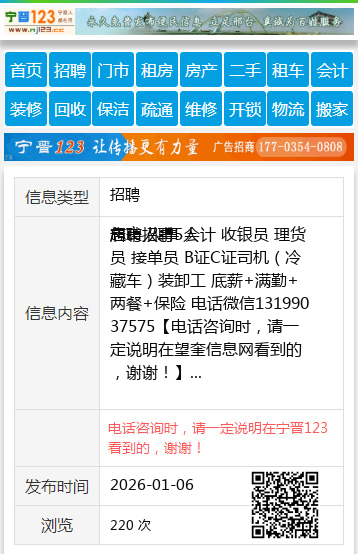 店长 人事 会计 收银员 理货员 接单员 B证C证司机(冷藏车)装卸工 底薪+满勤+两餐+保险 电话微信13199037575 【电话咨询时,请一定说明在望奎信息网看到的,谢谢!】 |