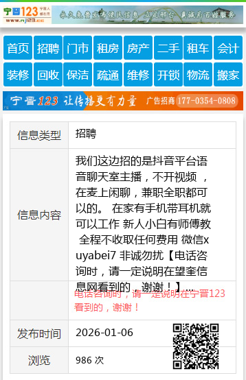 我们这边招的是抖音平台语音聊天室主播,不开视频 ,在麦上闲聊,兼职全职都可以的。 在家有手机带耳机就可以工作 新人小白有师傅教 全程不收取任何费用 微信xuyabei7 非诚勿扰 【电话咨询时,请一定说明在望奎信息网看到的,谢谢!】 |