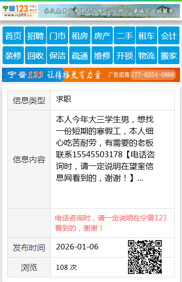 本人今年大三学生男,想找一份短期的寒假工,本人细心吃苦耐劳,有需要的老板联系15545503178
