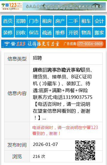 店长、人事、会计、收银员、理货员、接单员、B证C证司机(冷藏车)、装卸工、待遇:底薪+满勤+两餐+保险 联系方式:电话13199037575 【电话咨询时,请一定说明在望奎信息网看到的,谢谢!】 |