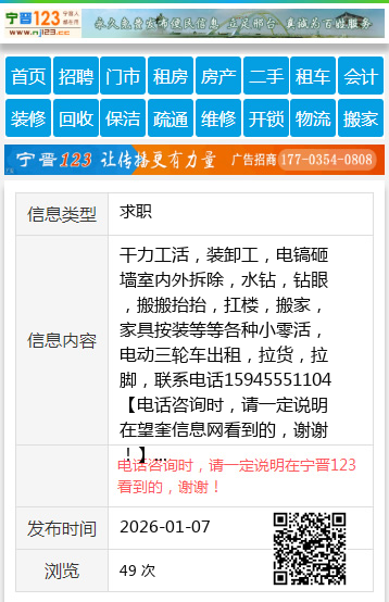 干力工活,装卸工,电镐砸墙室内外拆除,水钻,钻眼,搬搬抬抬,扛楼,搬家,家具按装等等各种小零活,电动三轮车出租,拉货,拉脚,联系电话15945551104 【电话咨询时,请一定说明在望奎信息网看到的,谢谢!】 |