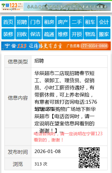 华辰超市二店现招聘春节短工、装卸工、理货员、促销员、小时工薪资待遇好,有带薪休假,可上养老保险,有意者可拨打咨询电话:15765798271