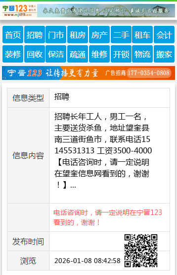 招聘长年工人,男工一名,主要送货杀鱼,地址望奎县南三道街鱼市,联系电话15145531313 工资3500-4000 【电话咨询时,请一定说明在望奎信息网看到的,谢谢!】 |