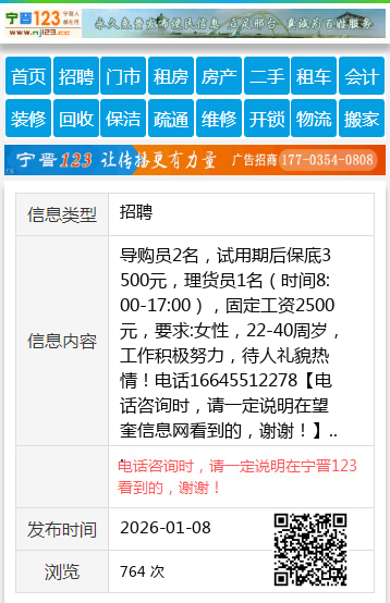 导购员2名,试用期后保底3500元,理货员1名(时间8:00-17:00),固定工资2500元,要求:女性,22-40周岁,工作积极努力,待人礼貌热情!电话16645512278 【电话咨询时,请一定说明在望奎信息网看到的,谢谢!】 |