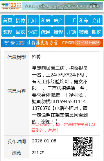 星际网咖南二店,招收银员一名,上24小时休24小时,有无工作经验均可,男女不限, 。三百店招保洁一名,要求身体健康,干净利落,短期勿扰☎️15945531114 1376376 【电话咨询时,请一定说明在望奎信息网看到的,谢谢!】 |