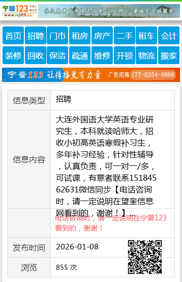 大连外国语大学英语专业研究生,本科就读哈师大,招收小初高英语寒假补习生,多年补习经验,针对性辅导,认真负责,可一对一/多,可试课,有意者联系15184562631微信同步 【电话咨询时,请一定说明在望奎信息网看到的,谢谢!】 |