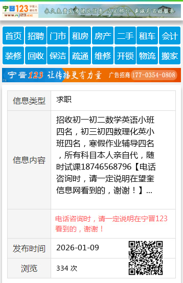 招收初一初二数学英语小班四名,初三初四数理化英小班四名,寒假作业辅导四名,所有科目本人亲自代,随时试课18746568796 【电话咨询时,请一定说明在望奎信息网看到的,谢谢!】 |