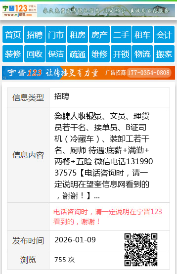 会计、收银员、文员、理货员若干名、接单员、B证司机(冷藏车)、装卸工若干名、厨师 待遇:底薪+满勤+两餐+五险 微信电话13199037575 【电话咨询时,请一定说明在望奎信息网看到的,谢谢!】 |