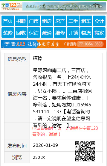 星际网咖南二店,三百店,各收银员一名,上24小时休24小时,有无工作经验均可,男女不限, 。三百店招保洁一名,要求身体健康,干净利落,短期勿扰☎️15945531114 137 【电话咨询时,请一定说明在望奎信息网看到的,谢谢!】 |