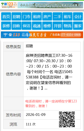 麻辣烫招聘煮面工07:30~16:00/ 07:30~20.30/10:00~23:00/15:00~23:00 每个时间个一名 电话15045538388 【电话咨询时,请一定说明在望奎信息网看到的,谢谢!】 |