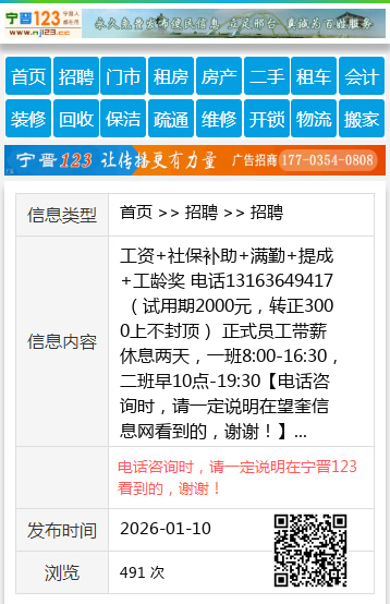 工资+社保补助+满勤+提成+工龄奖 电话13163649417 (试用期2000元,转正3000上不封顶) 正式员工带薪休息两天,一班8:00-16:30,二班早10点-19:30