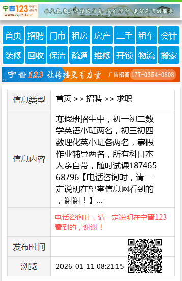 寒假班招生中,初一初二数学英语小班两名,初三初四数理化英小班各两名,寒假作业辅导两名,所有科目本人亲自带,随时试课18746568796