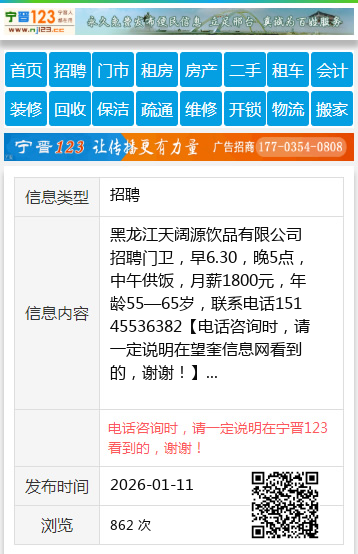 黑龙江天阔源饮品有限公司招聘门卫,早6.30,晚5点,中午供饭,月薪1800元,年龄55—65岁,联系电话15145536382 【电话咨询时,请一定说明在望奎信息网看到的,谢谢!】 |