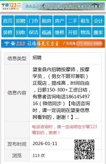 望奎县内招聘按摩师,按摩学员,(男女不限可兼职) 正规店,提成高,时间自由,日薪150-300+工资日结,有意者咨询电话18614549716(微信同步) 【电话咨询时,请一定说明在望奎信息网看到的,谢谢!】 |