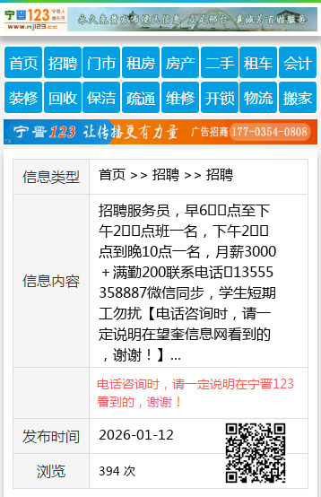 招聘服务员,早6️⃣点至下午2️⃣点班一名,下午2️⃣点到晚10点一名,月薪3000+满勤200联系电话☎13555358887微信同步,学生短期工勿扰