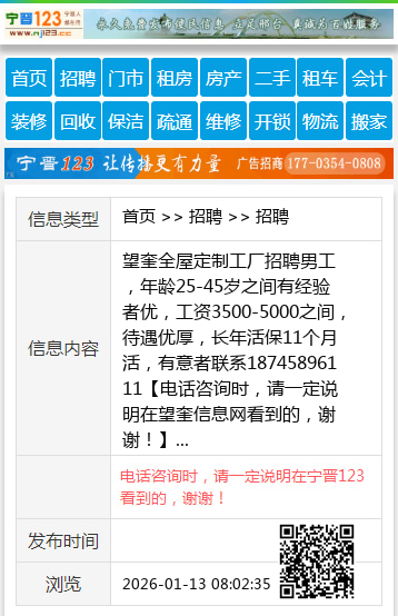 | 防骗提醒: | 望奎信息网(www.wangkui.cc)提醒您:手工活、网络兼职、刷单,都是骗子!凡以各种名义收取费用的都是骗子!找工作是往兜里挣钱,让你往外掏钱的都是骗子!异地招聘请提高警惕,谨防诈骗! |