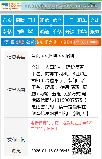 会计、人事5人、理货员若干名、商务车司机、B证C证司机(冷藏车)、装卸工若干名、厨师 、待遇:底薪+满勤+两餐+五险 联系方式:电话微信同步13199037575